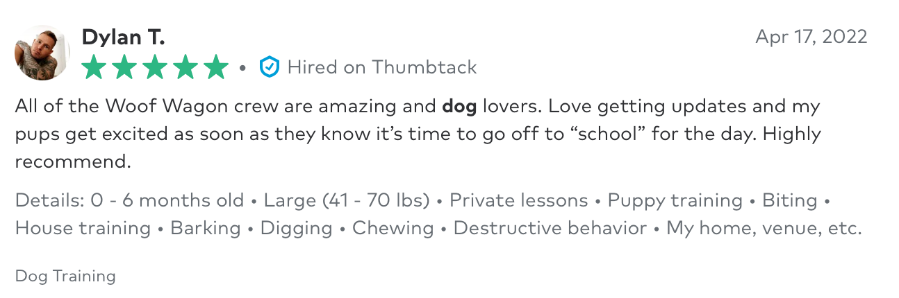 “I contacted Woof Wagon because our dog was barking aggressively to any stranger coming to our house. I had a phone consultation with Lauren and she was very helpful with guiding me with what would be the best training for our dog.”